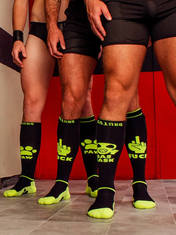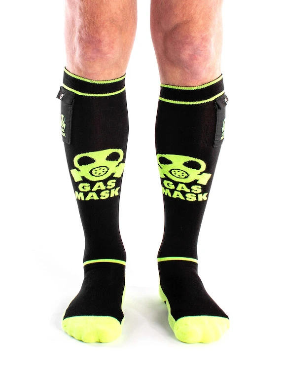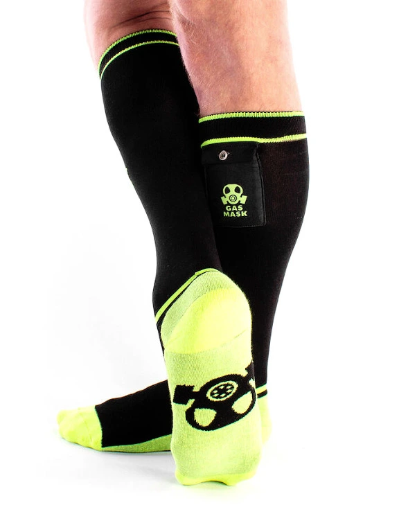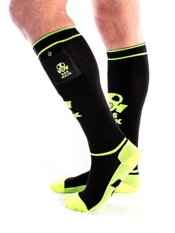 Mettez-vous dans l’ambiance pour une action coquine avec ces chaussettes hautes « Gas Mask » de Brutus en noir et jaune n?on et exprimez votre pr?f?rence personnelle pour les activit?s amusantes.