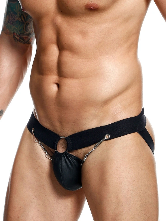 Le jockstrap Chain est fabriqu? dans une mati?re semblable ? du cuir de couleur noire ?l?gante avec deux cha?nes sur le devant pour attirer toute l’attention sur votre entrejambe.