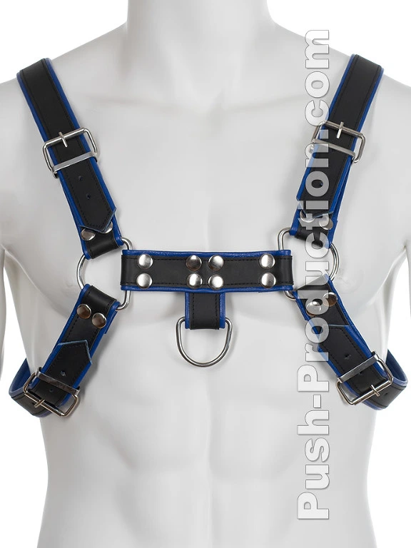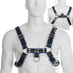 Le harnais BDSM robuste en cuir v?ritable noir et bleu est con?u pour votre plaisir sauvage lors de d?fil?s, soir?es ? th?mes ou en club.