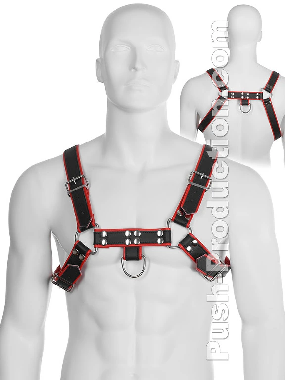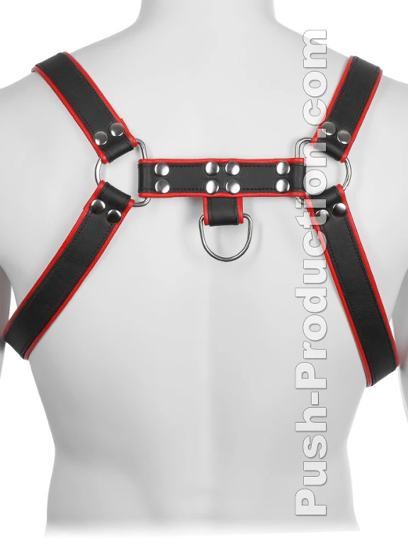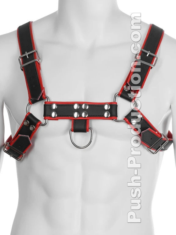 Le harnais BDSM robuste en cuir v?ritable noir et rouge est con?u pour votre plaisir sauvage lors de d?fil?s, soir?es ? th?mes ou en club.