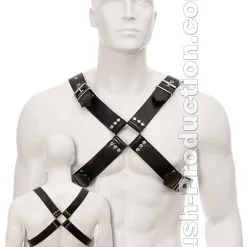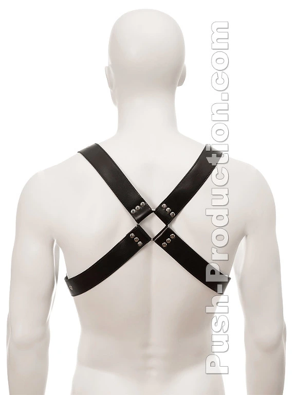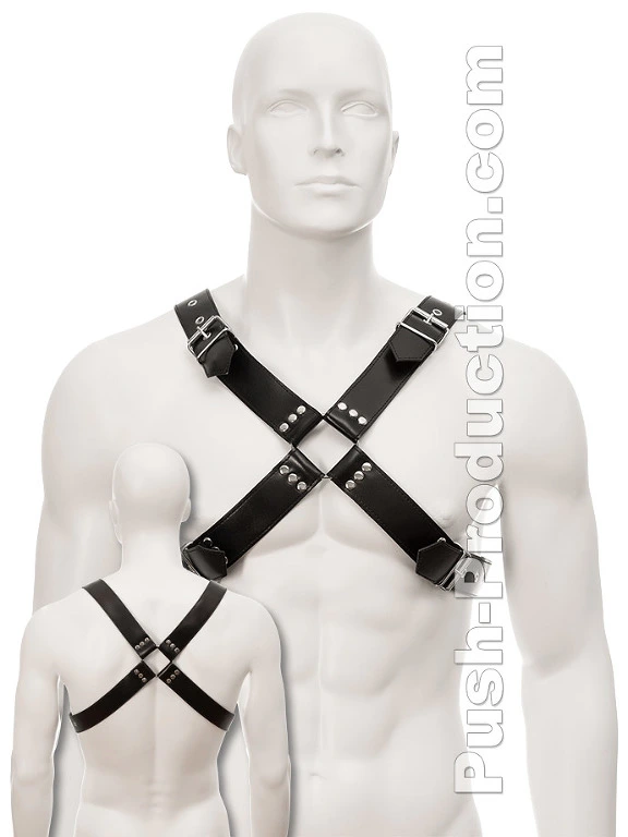 Ce superbe harnais de torse en forme de croix?est fait en cuir?noir avec des?boutons en m?tal. Toutes les finitions sont en m?tal. En bo?te, en parade ou lors de vos jeux intimes, ce harnais va?bien mettre en ?vidence votre corps d’athl?te.?Quatre bandes de cuir sont reli?es au niveau de la poitrine et du dos par un anneau de m?tal.