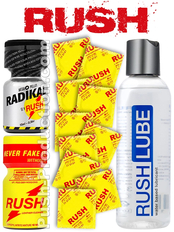Le NOUVEAU pack de poppers inclut deux de nos meilleurs poppers, le Rush Original et le Radikal Rush, 25 pr?servatifs Rush et le lubrifiant ? base d’eau Rush Lube.