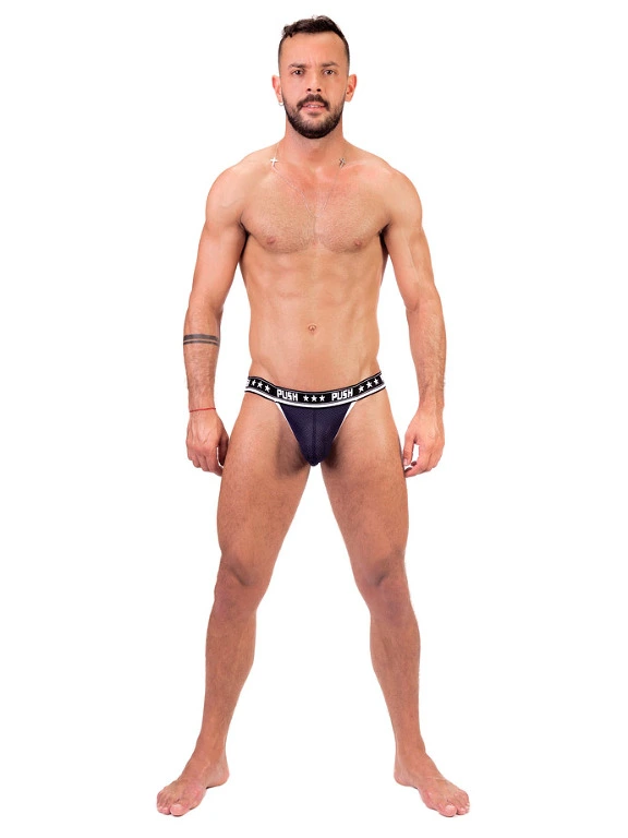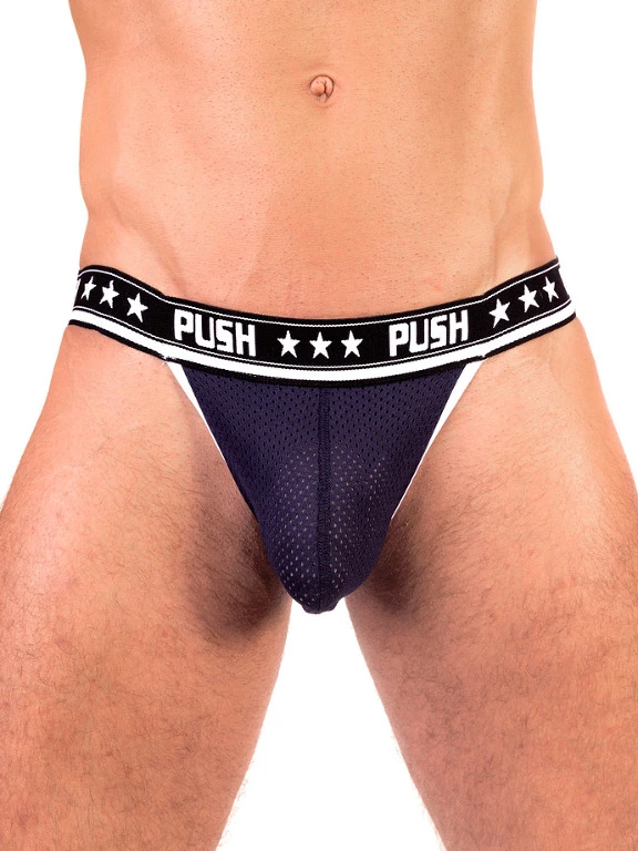 Le jockstrap en Mesh Premium bleu marine de Push Underwear est un jockstrap tr?s sexy avec des reflets blancs et des couleurs contrast?es qui attirent l’attention des gens sur votre ?norme bulge fourni par la poche avant et les lani?res qui soutiennent vos fesses.