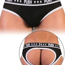 Avec le nouveau jockstrap noir et blanc Push Premium en tissu maill?, vous allez pouvoir montrer votre c?t? sexy ? tout le monde gr?ce ? la fen?tre ouverte sur vos fesses. Le tissu maill? rappelle les maillots de sport pour vous donner le meilleur confort lors de vos sessions sportives.