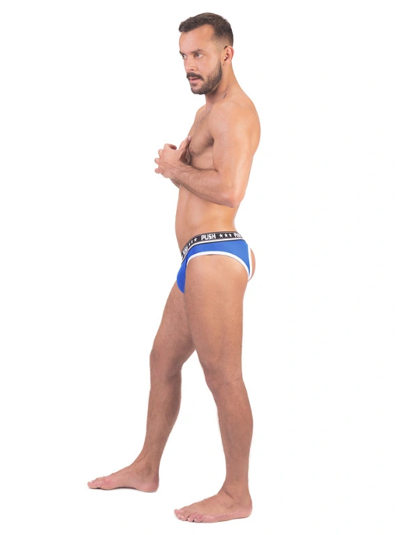 Avec le slip Premium Mesh Hole de PUSH, vous allez enfin pouvoir montrer votre c?t? sexy o? que vous soyez ! Ce slip bleu et blanc PUSH au design soign? combine une poche frontale moulante, une fen?tre sur vos fesses nues et une ceinture amincissante qui en font un sous-v?tement polyvalent et sexy pour l?homme moderne.