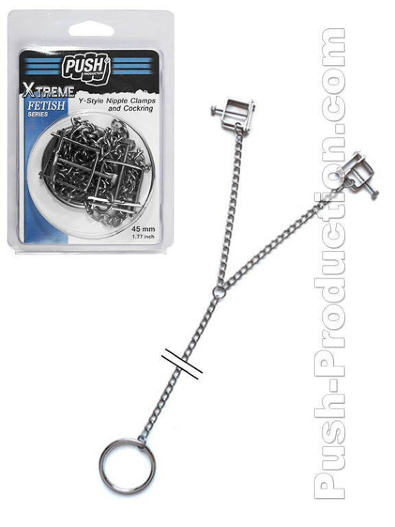 Deux pinces ? t?tons reli?es par une cha?ne ? un anneau de p?nis. Les pinces de t?tons peuvent ?tre r?gl?es de 20 ? 0 mm et sont donc parfaites pour augmenter la stimulation de douleur.