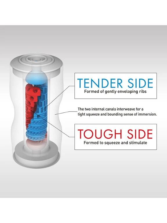 Faites la connaissance de Tender et Tough, les deux c?t?s de la Dual Sensation Cup qui vous laisseront sans voix apr?s votre s?ance ! Le c?t? Tender est form? de c?tes douces et enveloppantes qui entourent votre morceau et le stimulent joliment. Du c?t? Tough, vous d?couvrirez le tunnel stimulant avec une surface textur?e et un diam?tre serr?. Au milieu, les deux canaux internes s’entrecroisent pour un serrage stimulant et une sensation d’immersion excitante.